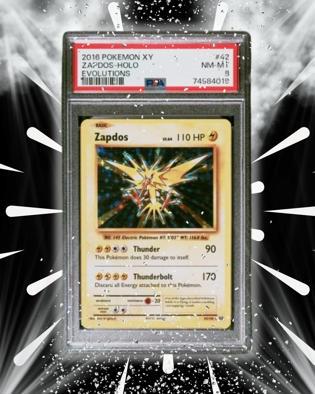 - 1 × Chase slab (PSA 8 XY Evolutions Zapdos Reverse Holo)